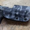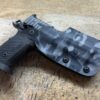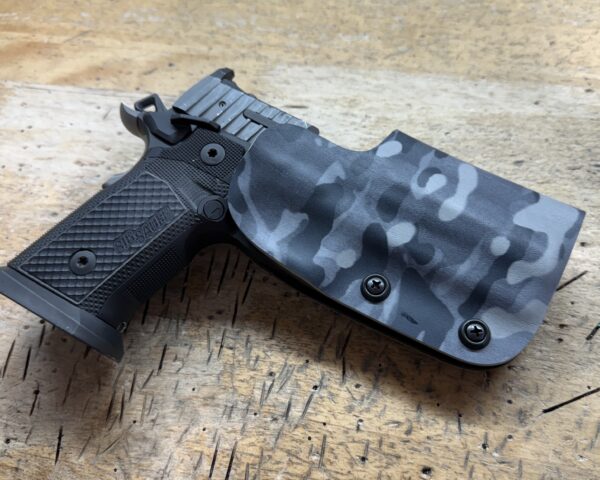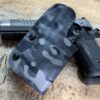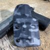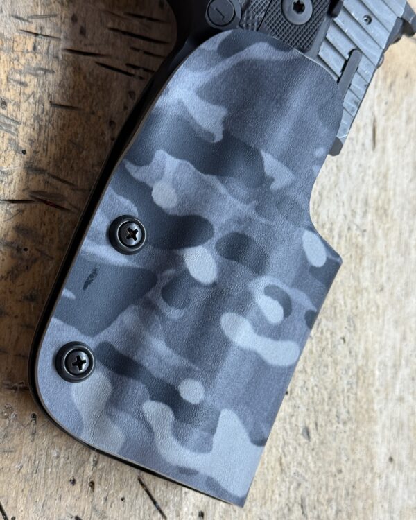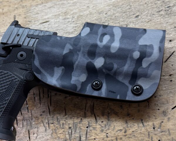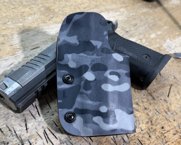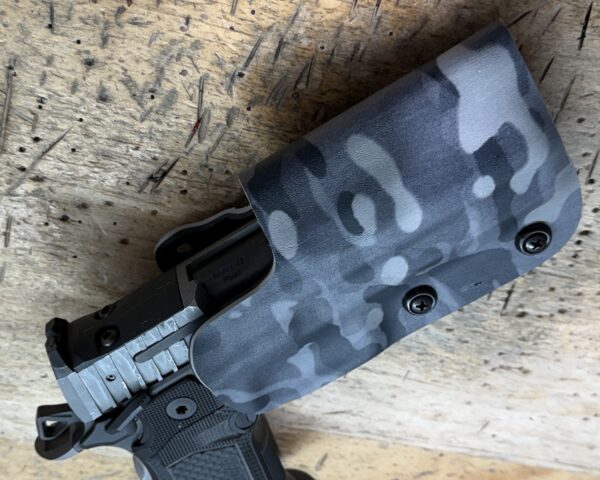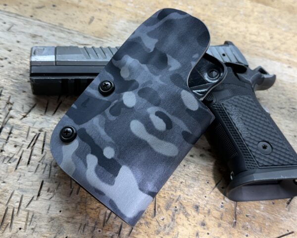It is available only in the tried and true double layer configuration. This features two layers of .08 or .093 thick Kydex to add a great deal of structure to your holster. The extra rigidity supports the low cut that we use, as well as reduces the flex and bounce that happens when you cut this much out of a single layer of Kydex. In addition to the stability, it gives you the ability to further add to the custom look of your rig. We feature everything from solid colors, carbon fiber look, and many custom camouflage patterns including Kryptek, Multicam, Hexcam and more.