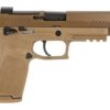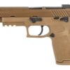 The P320-M17 is a 9mm, striker-fired pistol and comes with two (2) 21-round magazines. The pistol features a coyote-tan PVD coated stainless steel slide with the same optic cut as specified by the MHS contract, and black controls just like the pistols currently being shipped to the U.S. Army; it comes equipped with a SIGLITE front night sight and removable Night Sight rear plate. The P320-M17 features a coyote-tan carry-length grip module, available in three sizes, and comes standard with a manual safety.