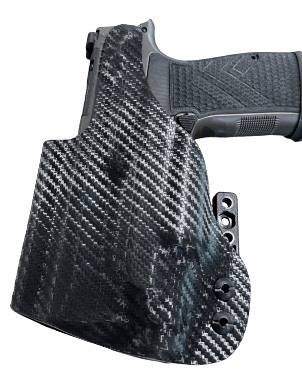 This holster ready to ship comes with a 1.5″ belt clip on it. If you are looking for something more, I would suggest look at our custom options.
