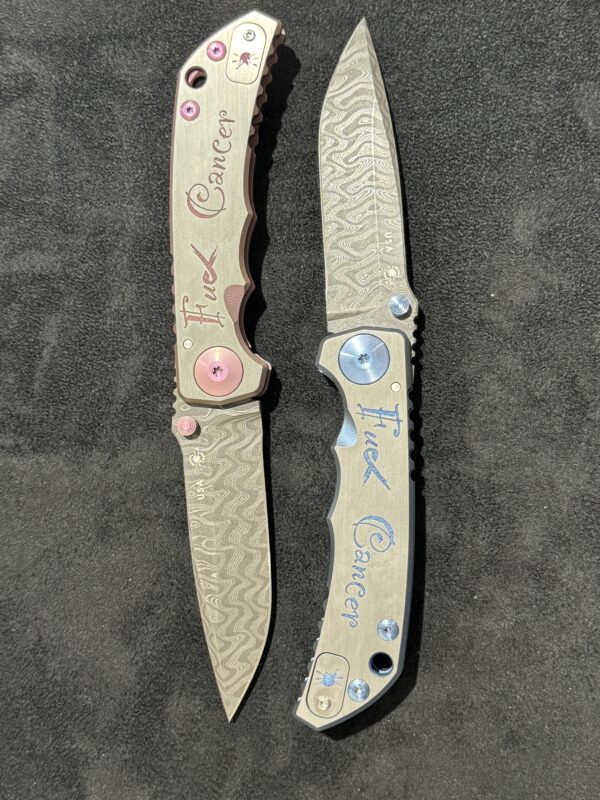These Fuck Cancer knives have been a passion for Bob and the team at RHT. In January 2020 Bob was diagnosed with Colon Cancer and spent 10 days in the hospital with surgery to remove the tumor, and then did 8 rounds of Chemo after that. This is where the Blue comes from. In February 2022 he then lost his mother to cancer, and again realized how much of an impact that cancer can play in families. These knives were designed by the team at RHT along with Spartan to make something that fits. Every year we will work on a design refresh with Spartan to make a collectable that can also be a family heirloom. Remember, NO 1 FIGHTS ALONE.