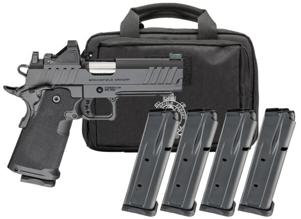The Prodigy from Springfield Armory® takes the proven 1911 platform and enhances it with double-stack capacity and a performance-driven feature set. Reconfigured around a double-stack magazine the Prodigy’s polymer grip module mounts to its forged steel frame offering capacities of 17+1 and 20+1. Optics ready with an ambidextrous safety and Picatinny rail the Prodigy combines the most beloved characteristics of the 1911 with modern capacity for unrivaled performance. – Caliber 9mm – Color Black – Barrel 4.25 Forged Stainless Steel Match Grade Bull 1:16 – Slide Forged Carbon Steel Black Cerakote® Optics-Ready – Frame Forged Carbon Steel Black Cerakote® – Sights Fiber Optic Front Black Serrated Rear Viridian RFX11 – Recoil System 2 Piece Full Length Guide Rod – Grips Polymer – Magazines (3) 17-Round (1) 20-Round – Weight 32.5 oz – Length 7.8 – Height 5.5