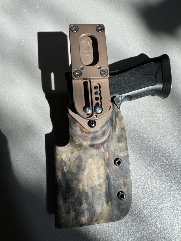 Machined from aluminum, the Springer Precision offset hanger attachment is versatile, stable and built for years of fast draws. Multiple mounting locations allow you to adjust for height and the angle of the holster. The belt mounting system allows you to mount the hanger on the most popular dual belt systems that are from 1.5″ to 1.75″ and 2.0″ wide. Mounting screws are included and it will also use the factory Bladetech screws.