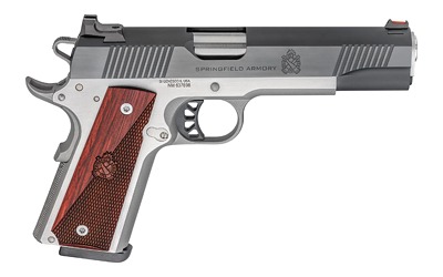 Springfield, Ronin, 1911, Single Action Only, Semi-automatic, Full Size, 45 ACP, 5″ Match Grade Barrel, Steel, Blued Slide, Stainless Frame, Wood Grips, Fiber Optic Front Sight, Tactical Rack White Dot Rear Sight, Manual Thumb Safety, 8 Rounds, 1 Magazines