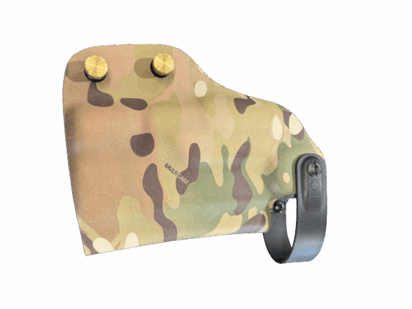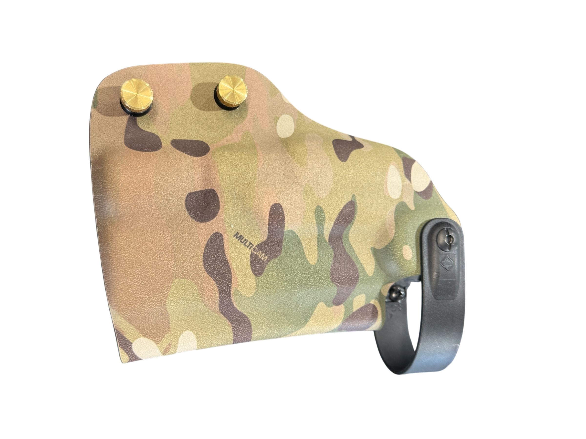 It is available only in the tried and true double layer configuration. This features two layers of .08 thick Kydex to add a great deal of structure to your holster. The extra rigidity supports the low cut that we use, as well as reduces the flex that happens when you push the activation on a single layer of Kydex. In addition to the stability, it gives you the ability to further add to the custom look of your rig. We feature everything from solid colors, carbon fiber look, and many custom camouflage patterns including Kyrptek, Supercam, Hexcam and more.