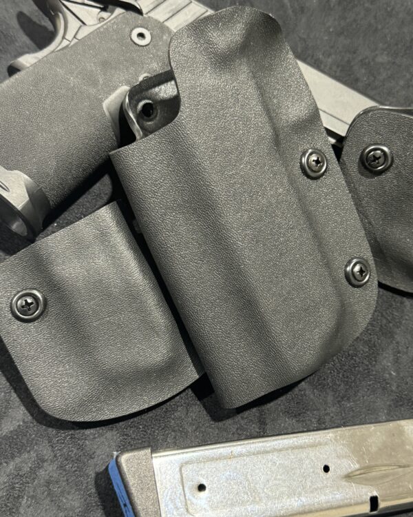 This package comes with a super heavy duty 0.125 Kydex instead of our normal two layers of .08. You get almost the same thickness as our famous double layer, but in one sheet. This allows us to streamline the manufacturing process to reduce some of the production time.