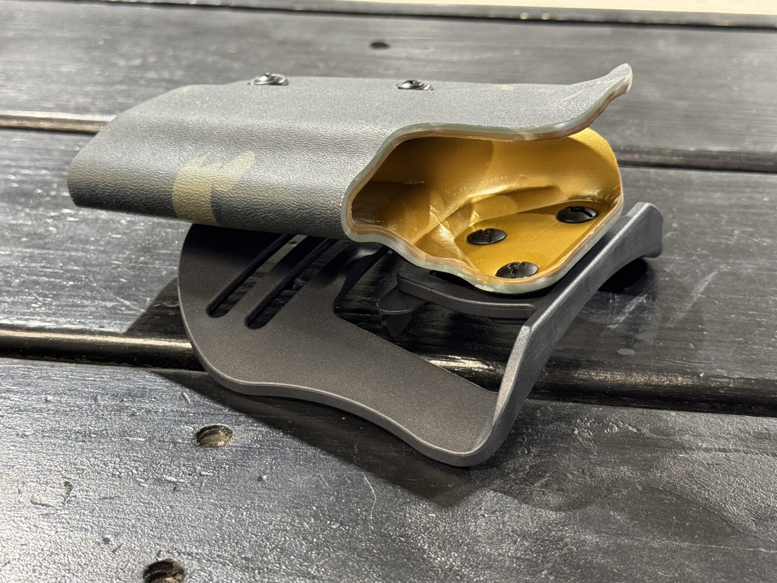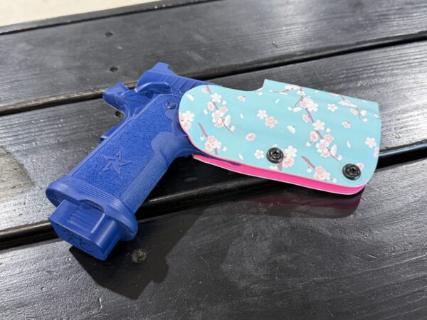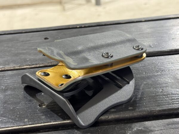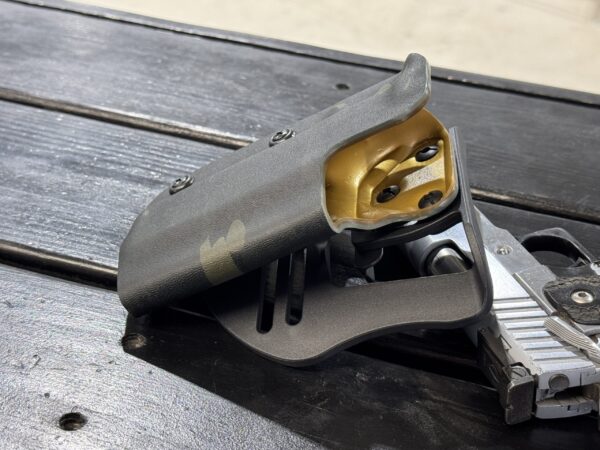 It is available only in the tried and true double layer configuration. This features two layers of .08 thick Kydex to add a great deal of structure to your holster. The extra rigidity supports the low cut that we use, as well as reduces the flex and bounce that happens when you cut this much out of a single layer of Kydex. In addition to the stability, it gives you the ability to further add to the custom look of your rig. We feature everything from solid colors, carbon fiber look, and many custom camouflage patterns including Kyrptek, Supercam, Hexcam and more.