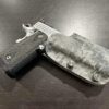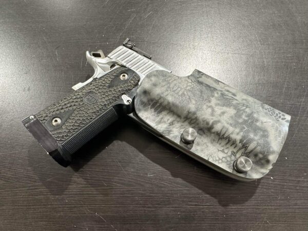 It is available only in the tried and true double layer configuration. This features two layers of .08 thick Kydex to add a great deal of structure to your holster. The extra rigidity supports the low cut that we use, as well as reduces the flex and bounce that happens when you cut this much out of a single layer of Kydex. In addition to the stability, it gives you the ability to further add to the custom look of your rig. We feature everything from solid colors, carbon fiber look, and many custom camouflage patterns including Kryptek, Supercam, Hexcam and more.