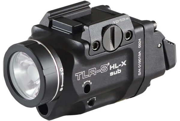 The TLR-8® HL-X sub high-lumen rail-mounted light is engineered to produce a longer reaching beam. It accepts either Streamlight’s SL-B9® USB-C rechargeable protected lithium-ion battery pack or a single CR123A lithium battery. Interchangeable rear paddle switches accommodate your shooting style. – Multi-fuel: Uses (1) Streamlight SL-B9® protected Li-Ion USB-C rechargeable battery pack (included) or (1) CR123A lithium battery – Engineered to produce a longer reaching beam – SL-B9: 1000 lumens; 10000 candela; 200m beam; runs 30 minutes (default) or programmable to 500 lumens; 5000 candela; 141m beam; runs 1 hour – CR123A: 500 lumens; 5000 candela; 141m beam; runs 1.5 hours – Laser mode runs 29 hours – Ambidextrous rear paddle switches with HIGH and LOW options – Safe-off feature prevents accidental activation; saves batteries – Rail grip clamp securely attaches/detaches without putting your hands in front of the muzzle – Durable anodized machined aluminum construction – User-enabled strobe function – Securely attaches to select subcompact handguns: GLOCK® 43X MOS/48 MOS and GLOCK® 43X RAIL/48 RAIL SIG SAUER® P365® and P365® XL (closed rail systems)* and the Springfield Armory® Hellcat® as well as select 1913 short railed subcompact handguns including the Smith & Wesson® M&P® M2.0® subcompact Beretta® Px4 Storm subcompact Springfield Armory® XD-E XD-S® and Hellcat® Pro Heckler & Koch® HK45 compact and SIG SAUER® P365® XMACRO – Length: 2.51 in (6.38 cm) – Weight w/ SL-B9: 2.87 oz (81.4g); Weight w/ CR123A: 2.77 oz (78.5g) – IPX4 water-resistant – Limited lifetime warranty – Assembled in the USA – Product Specifications – High Lumens 1000 – Beam Distance 200 meters – Max Candela 10000 – Battery Type SL-B9 Rechargeable Battery Pack CR123A Lithium – Battery Quantity 1 – Length 2.51 inches (6.38 centimeters) – Weight 2.77 ounces (78.53 grams) 2.87 ounces (81.36 grams) – Colors Black