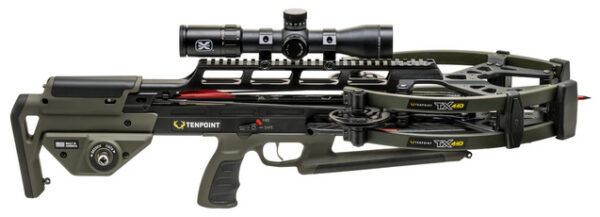 Meet the most technologically advanced compact crossbow the world has ever seen the TX 440 from TenPoint. – With 30-years of relentless innovation in crossbow technology boundaries have been broken and new standards have been set. – Meet the fastest most accurate and most technologically advanced crossbow the world has ever seen the TX 440 from TenPoint. – The TX 440 shoots 440 FPS and features NEW Twin-Riser Technology that riser flex and limb torq for greater down-range accuracy. – Measuring just 28 short and 6.5 narrow the TX 440 is equipped with a newly developed custom-built TriggerTech Trigger NEW ZERO-Trac Barrel and NEW GUIDE-Lock Arrow Rest System that create the most secure consistent launch platform ever built for a crossbow. – The NEW ACU-Lock Scope Bridge provides the ultimate foundation for scope stability and the NEW ACUSlide MAXX provides silent and safe de-cocking. – Features & Benefits – Twin-Riser Technology: 18% lighter and 2x stiffer than traditional risers resulting in 70% reduced riser flex for unmatched accuracy. – TriggerTech Precision Trigger: Using TriggerTech’s patented Zero-Creep Technology this 3lb. trigger features a clean crisp breaks like glass feel to help improve accuracy and precision. – CenterPunch HPX with Snap-In Nock: Alpha-Nock HPX snaps into the TriggerTech trigger box and allows you to hear and feel that your arrow is properly locked and loaded. – AR-Style Ambidextrous Thumb Safety: Conveniently located safety allows you to keep both hands on the crossbow and eyes locked on your game. – ZERO-Trac Barrel & GUIDE-Lock Arrow Rest System: Rail-less design reduces weight and eliminates arrow friction leading to straight nock travel and greater down-range accuracy. GUIDE-Lock Rest System features three points of contact for security and stability. The arrow rests on two never-wear spring-loaded ball-bearings and is held securely in place by a top-mounted retention brush giving you durability longevity and maximum precision at any distance. – ACUslide MAXX (patented) Cocking & De-Cocking System: Provides silent cocking and safe de-cocking. Stronger smoother and easier to operate. Remove your hand at any point and the handle stops in place. – ACU-Lock Scope Bridge: 25x stronger than traditional scope rails the NEW ACU-Lock Scope Bridge provides the ultimate foundation for scope stability. The full-length dual-mounted machined aluminum bridge allows for more scope adjustment heavier scope options & provides maximum in-the-field durability. – 100-yard EVO-X® Marksman Elite Scope 3.0: Variable speed scope maximizes accuracy out to 100-yards and built for speeds up to 550 FPS. – Package Includes: – EVO-X Marksman Elite Scope 3.0 (100-yard) – ACUslide MAXX – 3 CenterPunch HPX Carbon Arrows – Integrated String Stop – Bow Hook – Quiver – 28 Length (w/o foot stirrup) – 11 / 6.5 Width Axle-to-Axle (uncocked/cocked) – 12 Power Stroke – 300 Draw Weight – 7.2 lbs. Weight (w/out accessories) – ACUslide MAXX Cocking Device – EVO-X Marksman Elite 3.0 Scope – Forward Draw Draw style – ACUslide MAXX Safe De-Cocking