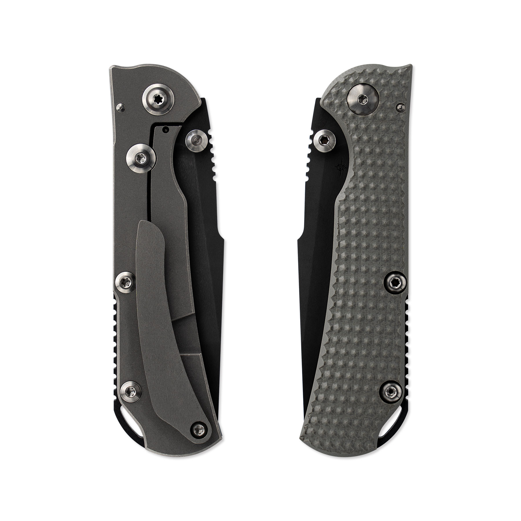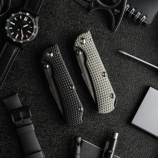 The new Chasm XLT also offers an innovative thumb stud design with a smooth tapered finish. We’ve improved the lockup action on the knife, and the open stop position is held secure by the titanium thumb studs. To ensure maximum thread retention on the thumb studs, we’ve added a T8 Torx driver head to allow for tightening. We have also provided a G10 backspacer with a lanyard hole to add to the overall rigidity of the frame, and the top of the G10 backspacer is machined with jimping notches for extra grip in the palm. Every Chasm XLT features a Black Oxide blade finish on CPM 154 steel and textured G10 show-side scale, offered in either Stealth or Carbon.
