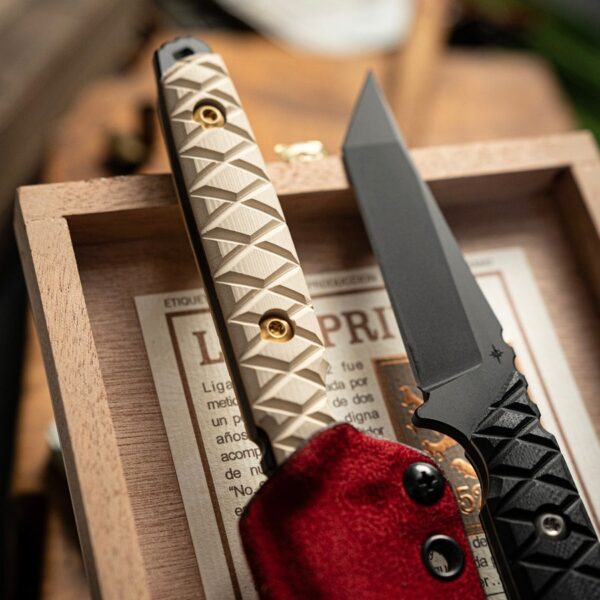Introducing the Toor Knives Kingpin, a sleek and tactical tanto blade that merges heritage craftsmanship with modern functionality. Originally released in 2020, the Kingpin was designed as a slim fixed blade specifically for snipers and reconnaissance operations, allowing it to lay extremely flat when mounted to your gear for easy concealment and access. The tanto blade design is distinguished by its strong tip and straight edge, making it exceptionally effective for piercing applications and providing remarkable control during detailed cutting tasks. Constructed from CPM 3V steel, the Kingpin boasts outstanding toughness and edge retention, ensuring that it holds up under rigorous use in various environments while maintaining a sharp edge for reliable performance.
