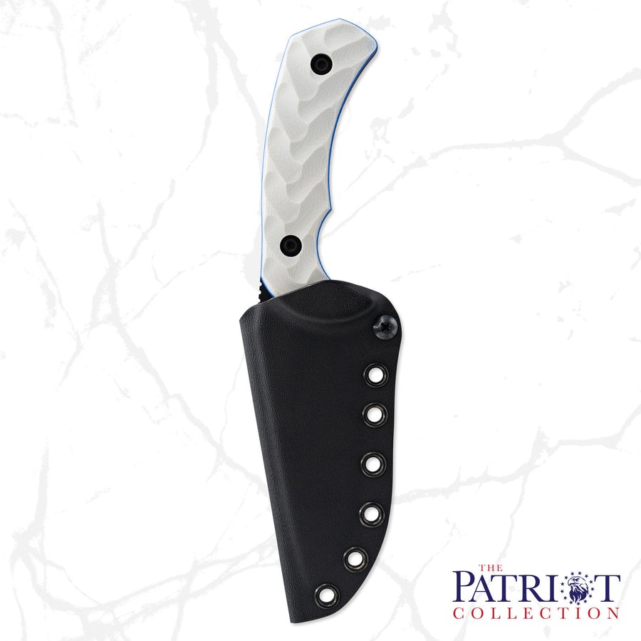 Featuring the Valor, Mullet and Serpent T, the Limited Edition Patriot Collection dons our Light Grey, Red & Blue G10 scales on CPM M4 and CPM Cru-Wear blades. Coated in a Smoke Black KG Gunkote finish, the Patriot Collection is designed for supreme durability and resistance to the harshest elements. Each blade also comes with a matching Smoke Black Kydex® sheath, compatible with any of our mounts.
