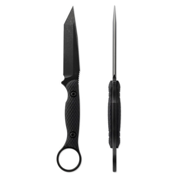 The Serpent’s 1.125” ring allows for an easy draw, with or without gloves. The blade is ground with a Tanto grind, leaving two razor sharp straight edges and at 0.1875” thick.