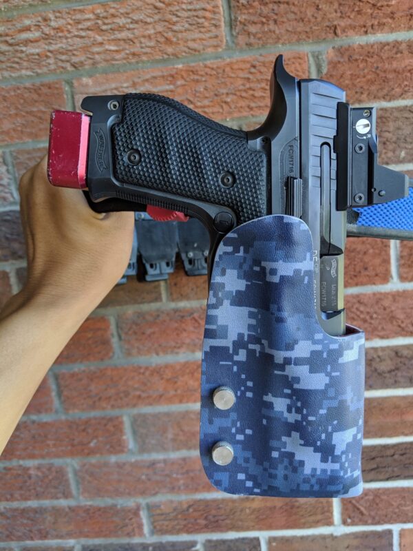 This is the top of the line double layer Red Hill Tactical Walther holster as used by many shooters around the country. The design stemmed from several top tier shooters sitting around in 2014 with a low cut single layer holster. We were not happy with the movement and flex. One of them said “Hey Bob, add a second layer”. The very next day the RHT double layer holster was born and always proudly Made in the USA. Since then this has been the leading holster in USPSA nationals data for multiple divisions including carry optics and production over many years.