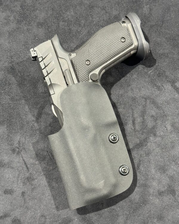 This is the top of the line double layer Red Hill Tactical Walther PDP 4.5 in. holster as used by many shooters around the country. The design stemmed from several top tier shooters sitting around in 2014 with a low cut single layer holster. We were not happy with the movement and flex. One of them said “Hey Bob, add a second layer”. The very next day the RHT double layer holster was born and always proudly Made in the USA. Since then this has been the leading holster in USPSA nationals data for multiple divisions including carry optics and production over many years.