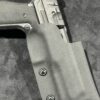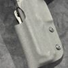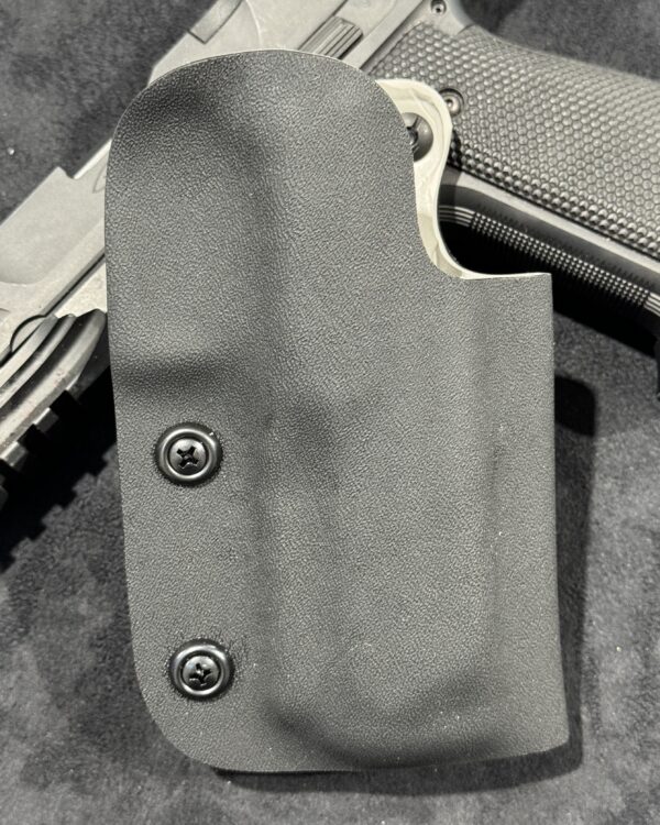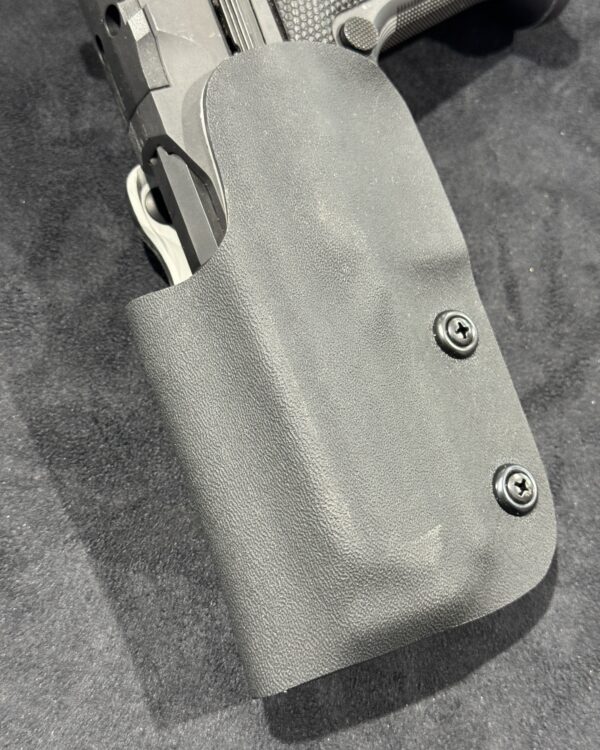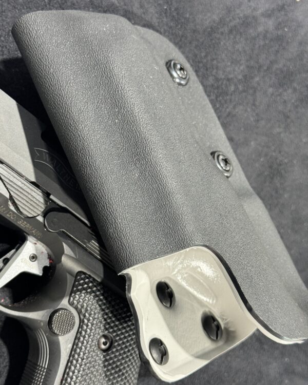 It is available only in the tried and true double layer configuration. This features two layers of .08 thick Kydex to add a great deal of structure to your holster. The extra rigidity supports the low cut that we use, as well as reduces the flex and bounce that happens when you cut this much out of a single layer of Kydex. In addition to the stability, it gives you the ability to further add to the custom look of your rig.