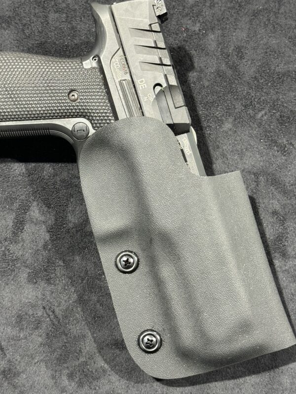 This is the top of the line double layer Red Hill Tactical Walther PDP Match Steel Frame holster as used by many shooters around the country. The design stemmed from several top tier shooters sitting around in 2014 with a low cut single layer holster. We were not happy with the movement and flex. One of them said “Hey Bob, add a second layer”. The very next day the RHT double layer holster was born and always proudly Made in the USA. Since then this has been the leading holster in USPSA nationals data for multiple divisions including carry optics and production over many years.