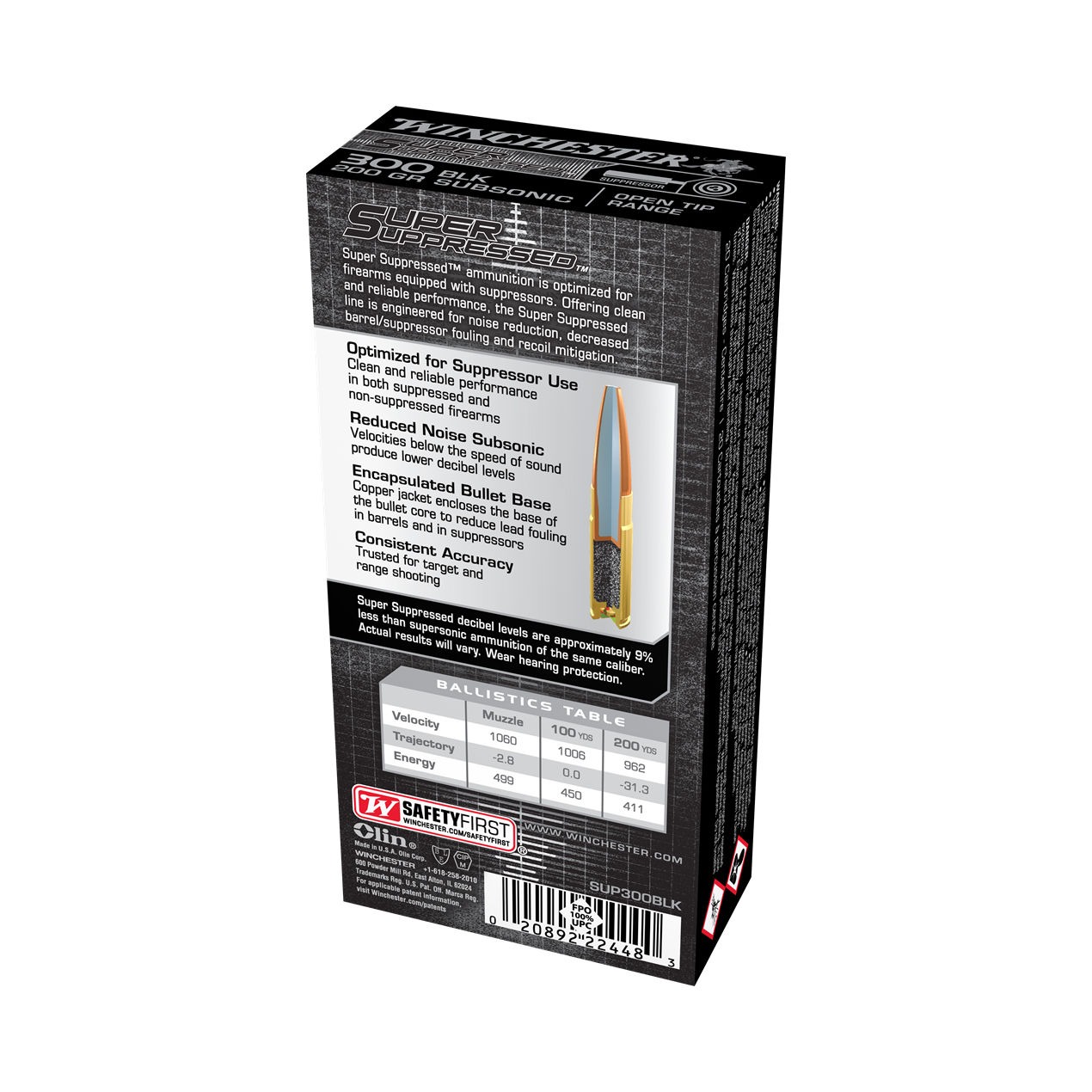 Super Suppressed ammunition is optimized for firearms equipped with suppressors. Offering clean and reliable performance, the Super Suppressed line is engineered for noise reduction, decreased barrel/suppressor fouling and recoil mitigation. Consistent performace and exceptional accuracy is backed by generations of Winchester legendary excellence.